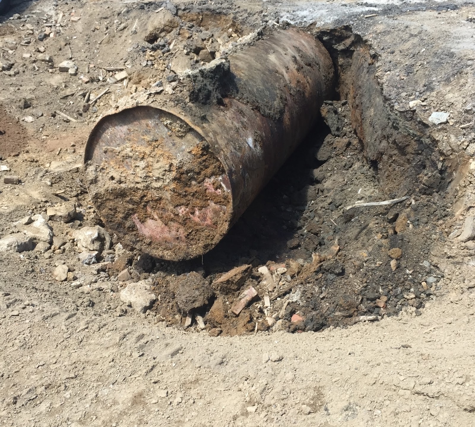 While clearing land for a parking lot, a 1000 gallon oil tank was discovered. You can see the impacted soil around it. We removed the tank and 20 tons of impacted soil.